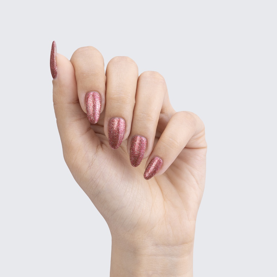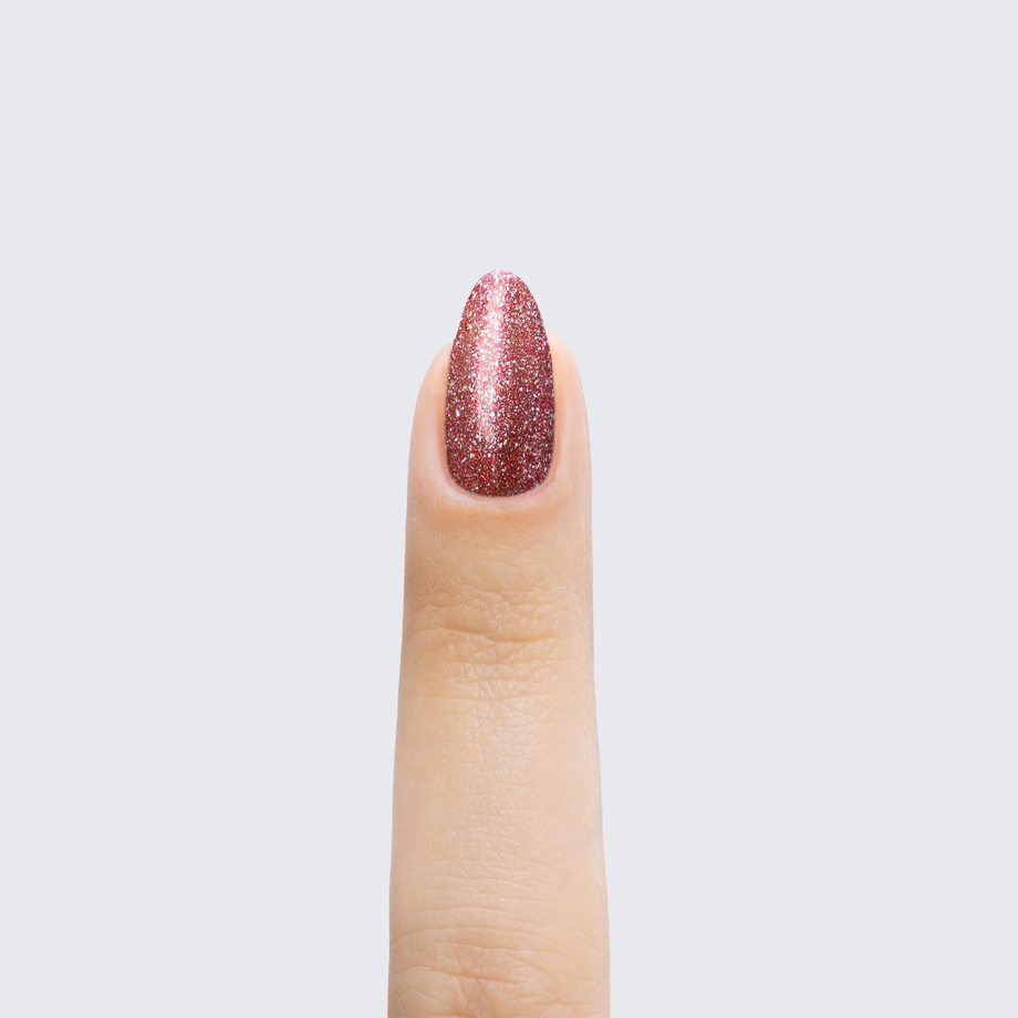 Ruby red. Metallic foil sparkle. Opaque. Cool undertone.